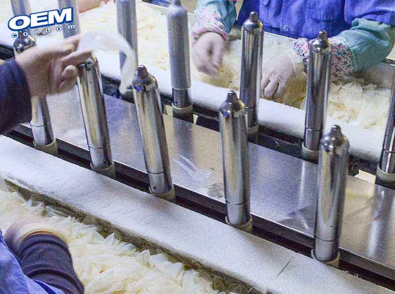 Mounting: Condoms are stretched onto metal mandrels (electrically grounded forms).